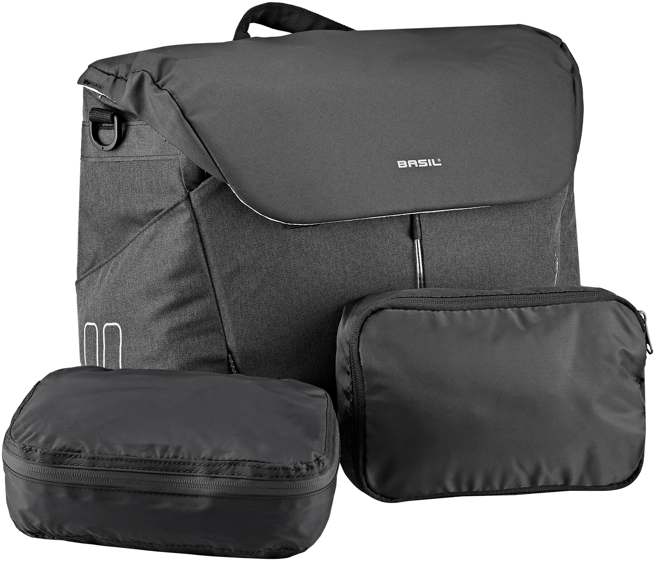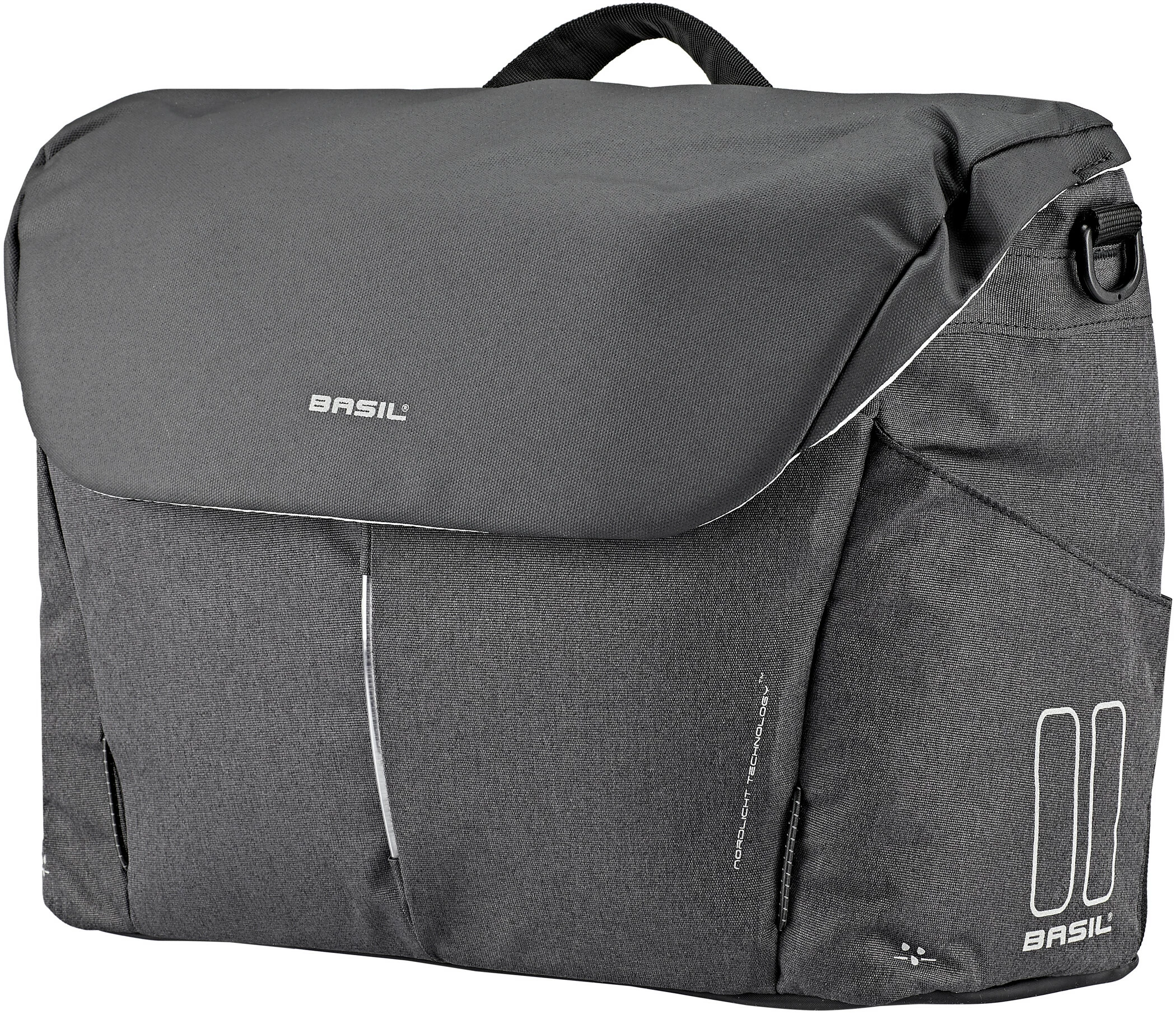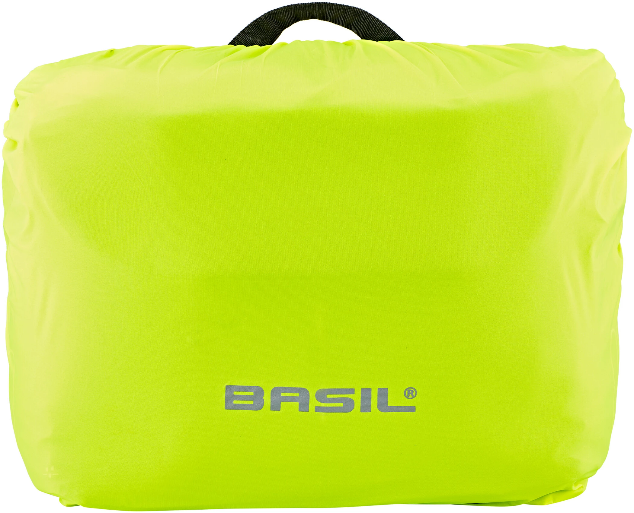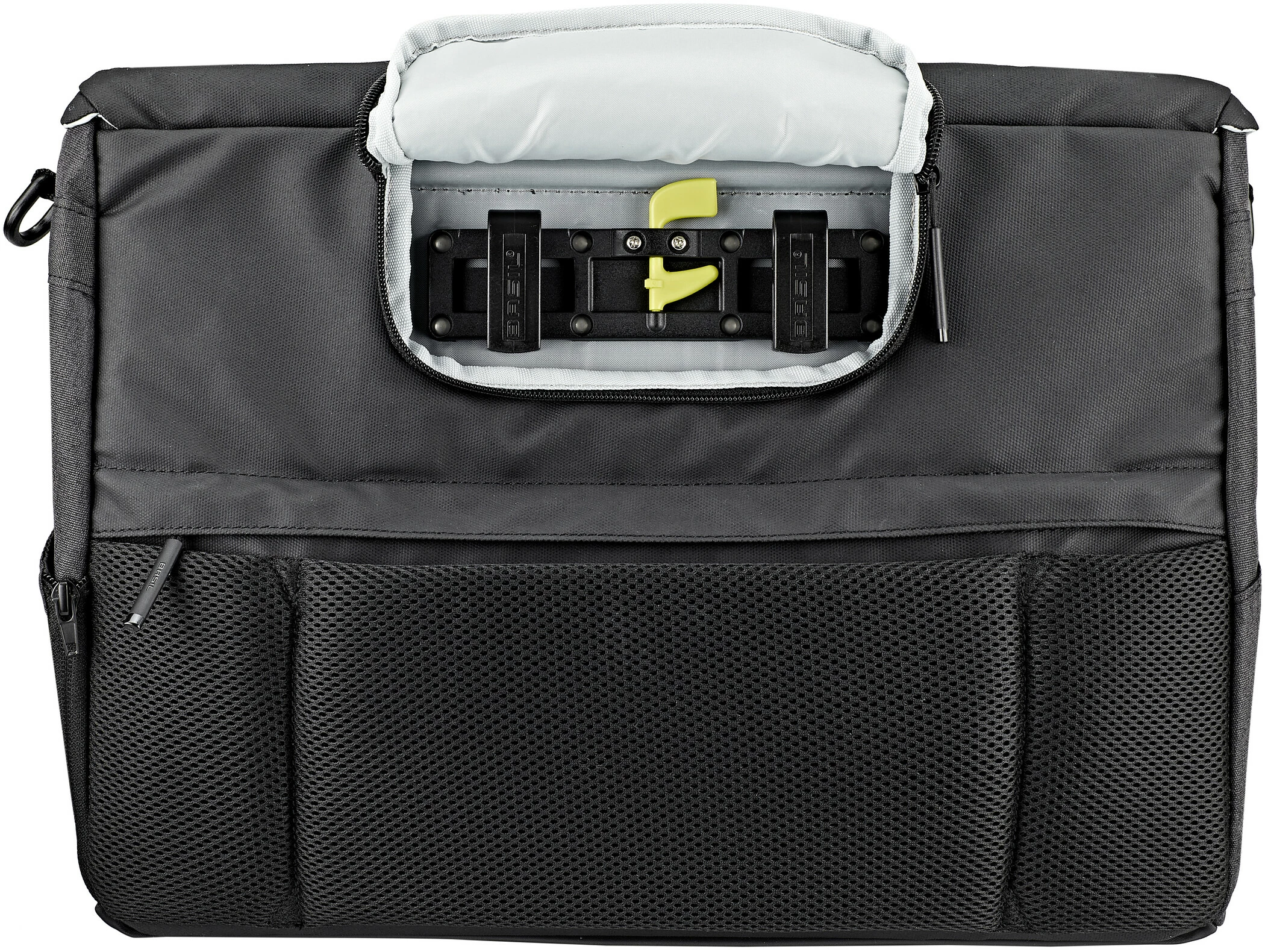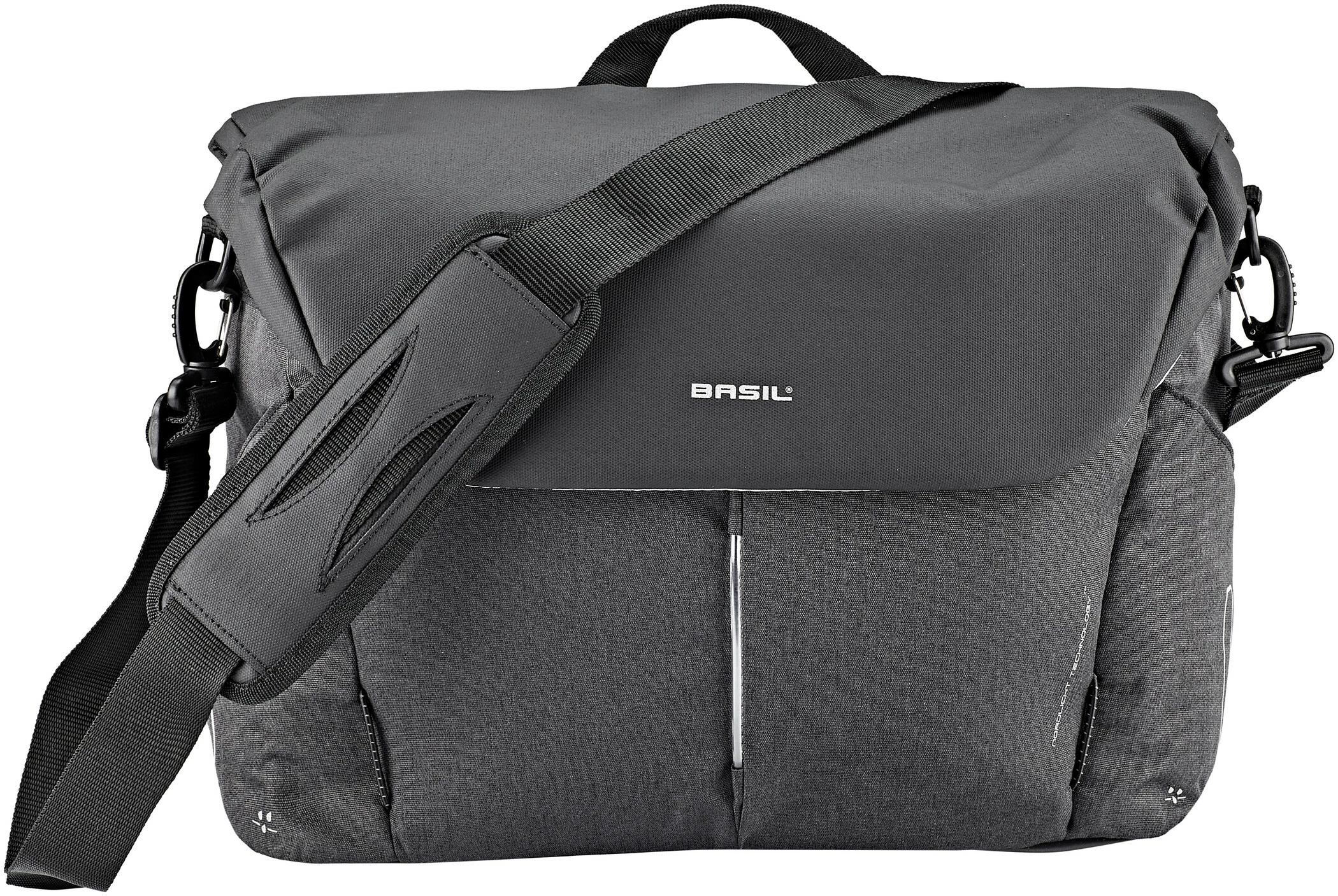 En anden smart funktion er LED-belysningen på forsiden af tasken (Nordlicht Technology). Tasken til bærbar computer har polstrede, aftagelige skulderremme og en fuldt polstret ryg. Det gør rygsækken utrolig behagelig at bære. Og med hook-on-systemet hænger du blot tasken på bagagebæreren på din (elektriske) cykel. Alt dette gør Basil B-Safe laptoptaske til cykler perfekt til pendling.