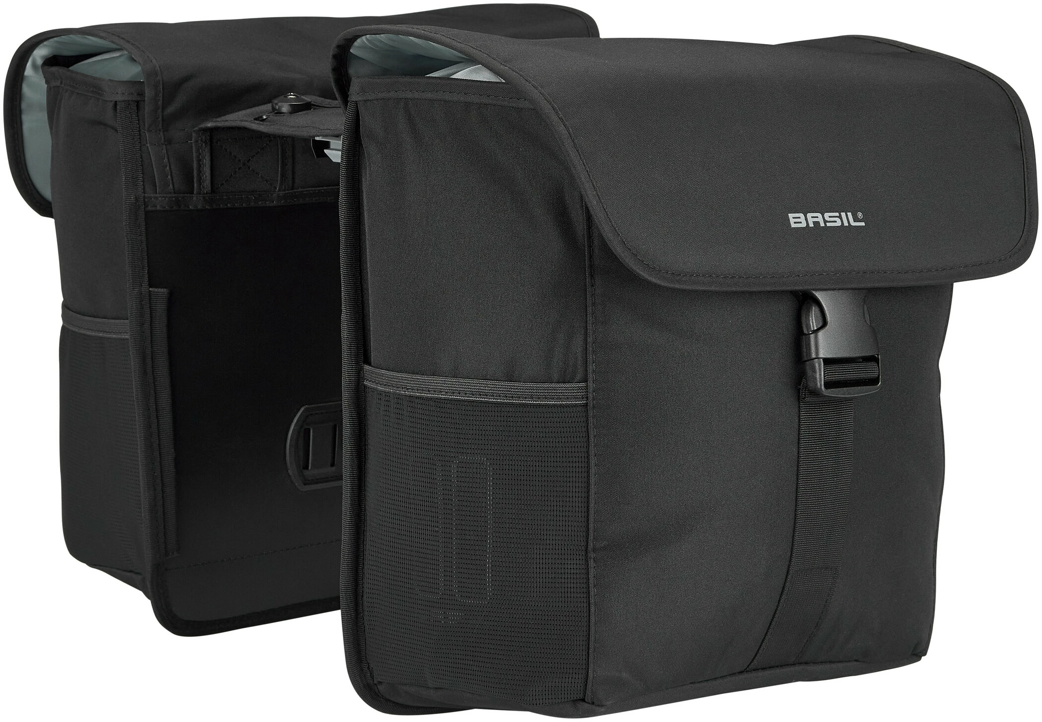 Basil GO Double Bag er en dobbelt cykeltaske iøjnefaldende grå farve til montering bag på din cykel. Disse tasker er perfekte til transport af dine indkøb, til at løbe ærinder eller til opbevaring i hverdagen, når du cykler. Tasken har et rummeligt hovedrum, som du kan lukke med en træksnor, samt en elastisk yderlomme på hver side. Det er praktisk, når du ønsker at tage en flaske vand eller en paraply med dig. Tasken har en samlet kapacitet på 32 liter, hvilket gør den stor nok til dine dagligvarer. Den dobbelte cykeltaske er fremstillet af vandafvisende polyester af høj kvalitet. Takket være Universal Bridge-systemet kan du nemt fastgøre tasken til din bagagebærer og til bagagebæreren på din elcykel. Universal Bridge-systemet består af otte slots.