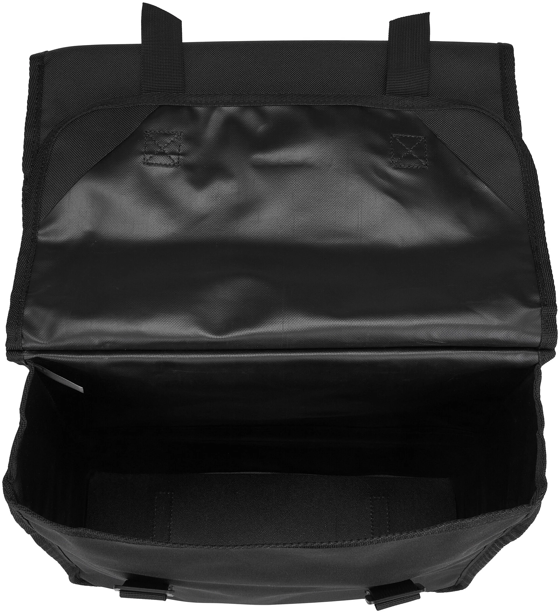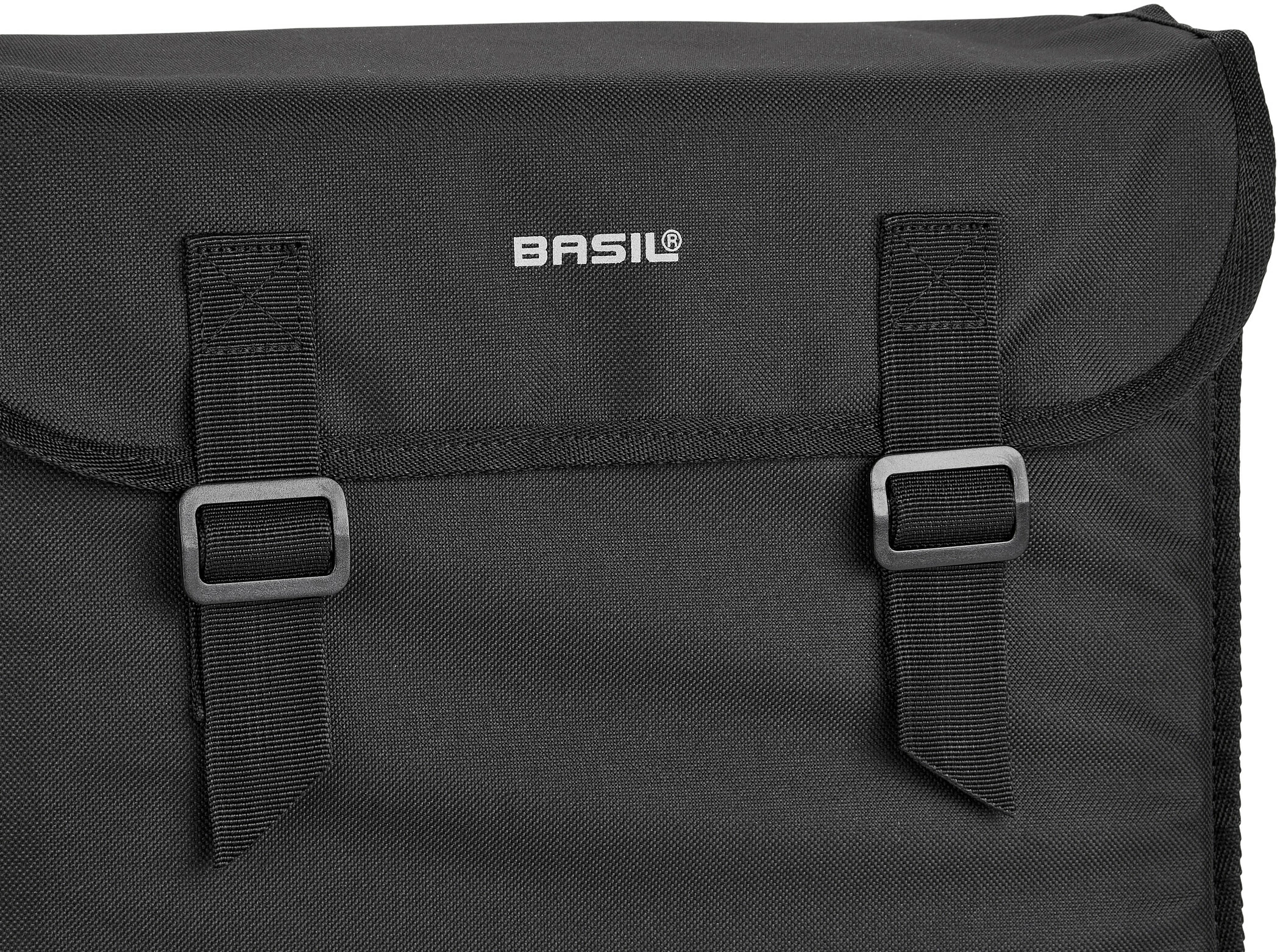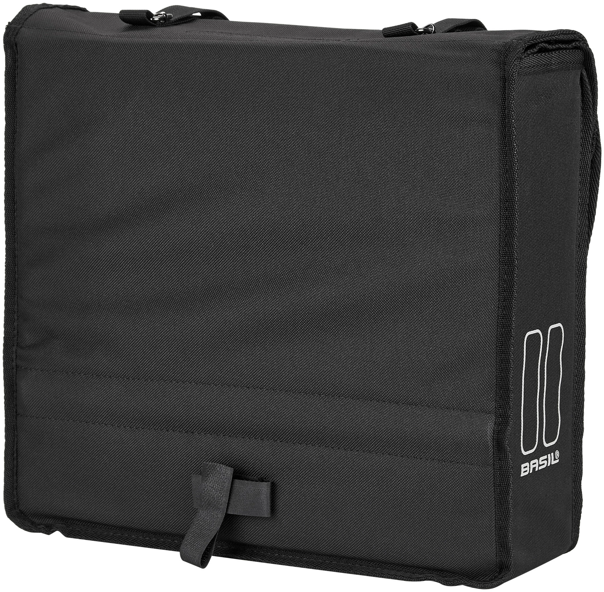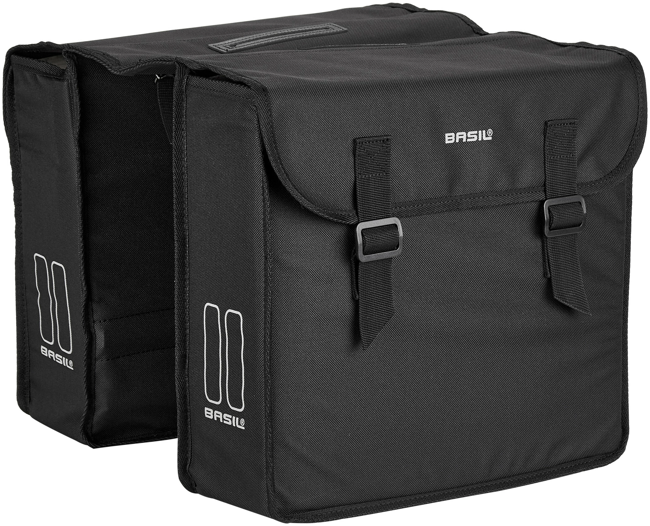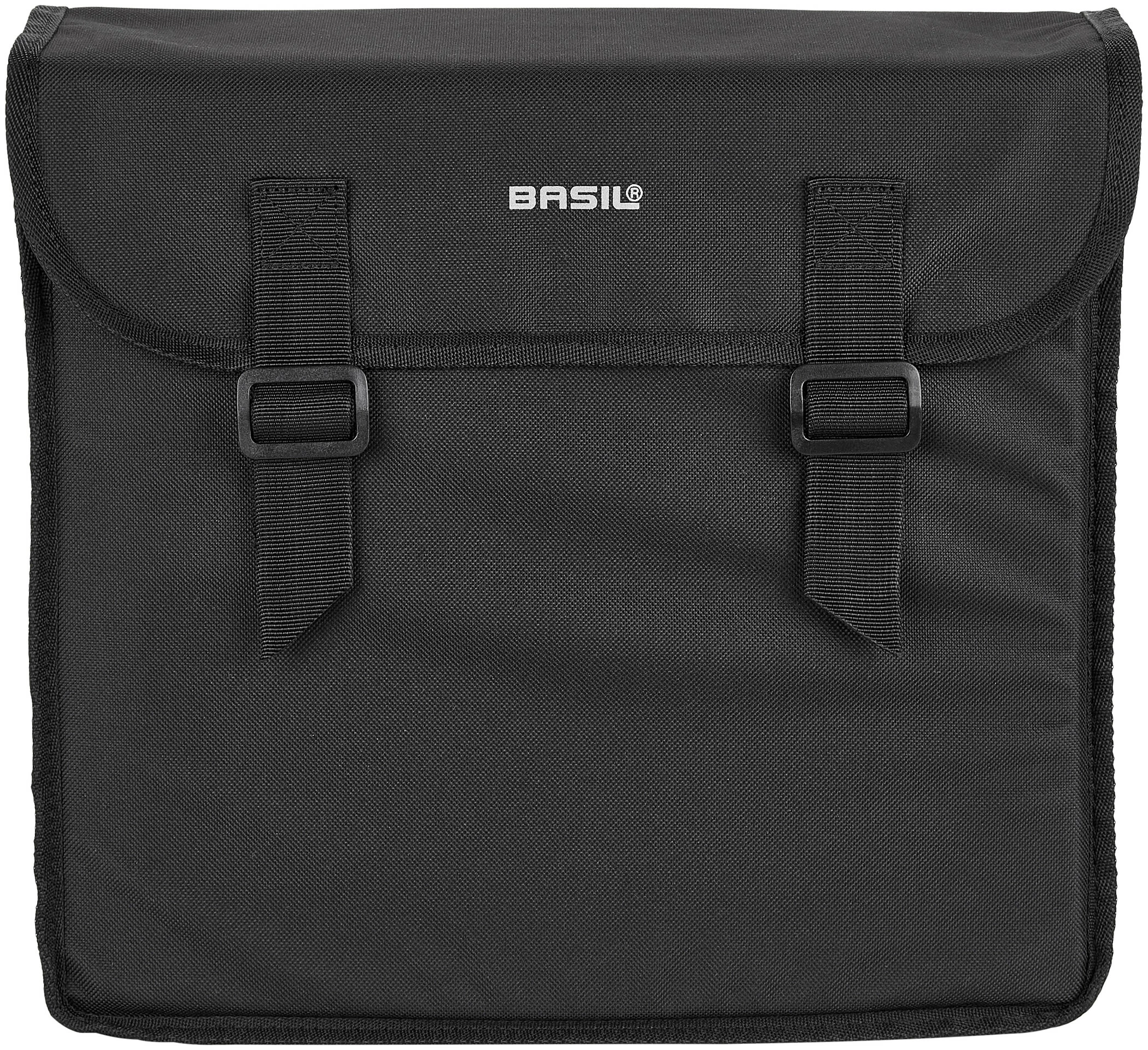 Basil Mara dobbelt taske til bagagebæreren er fremstillet af vandafvisende 600D-polyester. Venstre og højre taske er fast forbundet med hinanden og er placeret på stativet, så de hænger sidelæns på baghjulet. Det foldbare taske-materiale har yderligere dobbelte reflektorflader på forsiden og bagsiden. Udsparinger til spændestropper giver dig mulighed for at bruge toppen af stellet, selv med taskerne monteret. To spænder lukker sidelommerne forsvarligt. Standardversionen af den her tilbudte Mara-dobbeltbag har et samlet transportvolumen på 26 liter.