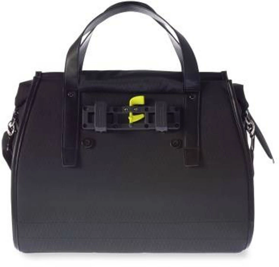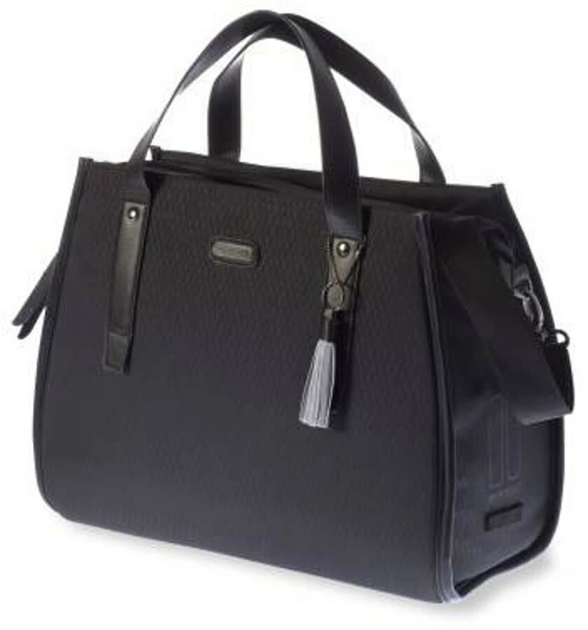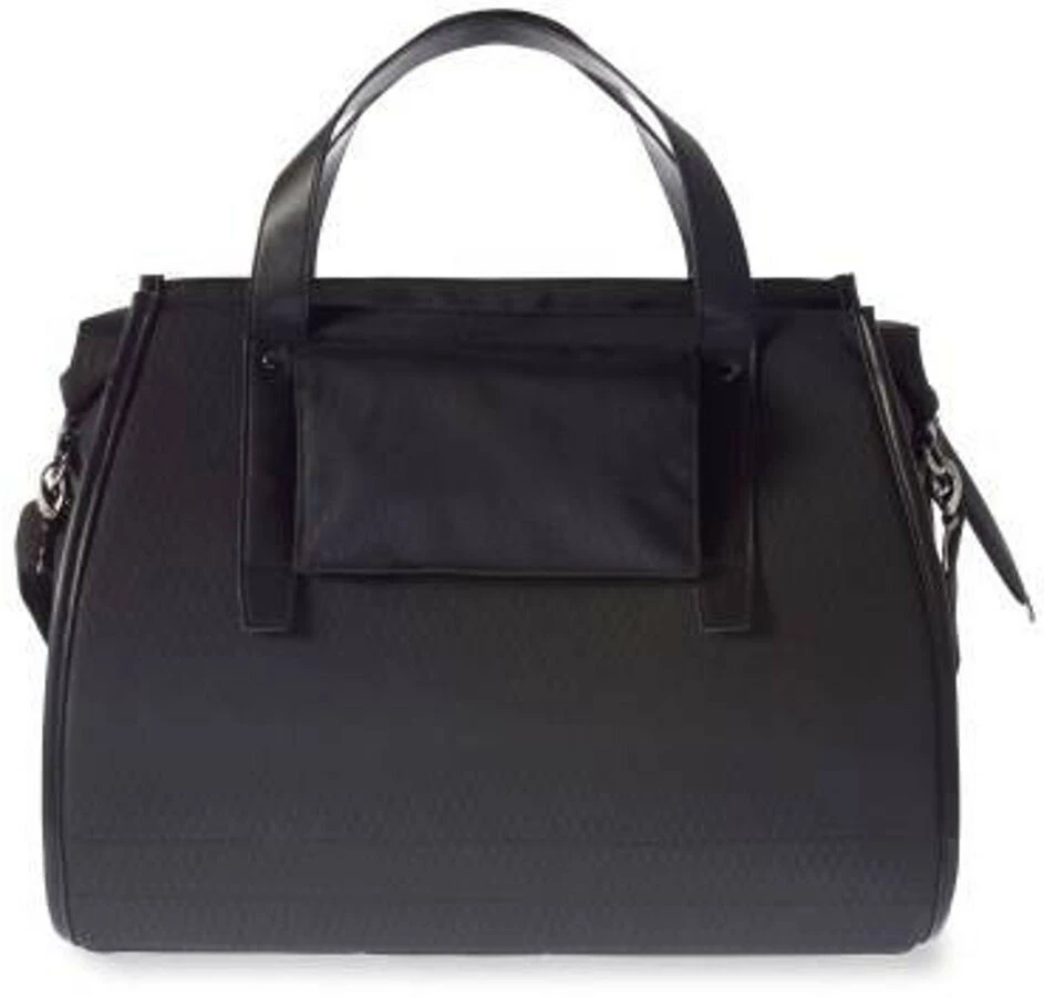 Basil Noir Business Bag er en elegant sort cykel-, skulder- og håndtaske i ét. Uanset om du er på vej til kontoret eller en frokostaftale, vil denne taske gøre din cykeltur nemmere og mere behagelig. Med dens cobraprint-æstetik og veganske læderdetaljer vil du se stilfuld ud, uanset om du vælger et elegant eller business-look. Denne business-taske er vandtæt og holder alle dine ting tørre. Tasken har et rumindhold på 17 liter og har en rulle med lynlås og flere rum. Der er et rum foran og et rum med lynlås på indersiden, så du kan opbevare dine ting overskueligt. Takket være håndtaget og den aftagelige skulderrem kan tasken bruges både som skuldertaske og som håndtaske. Hook-On-systemet sikrer, at tasken er nem at fastgøre til bagagebæreren. Dette system er omhyggeligt skjult med en låsbar klap.