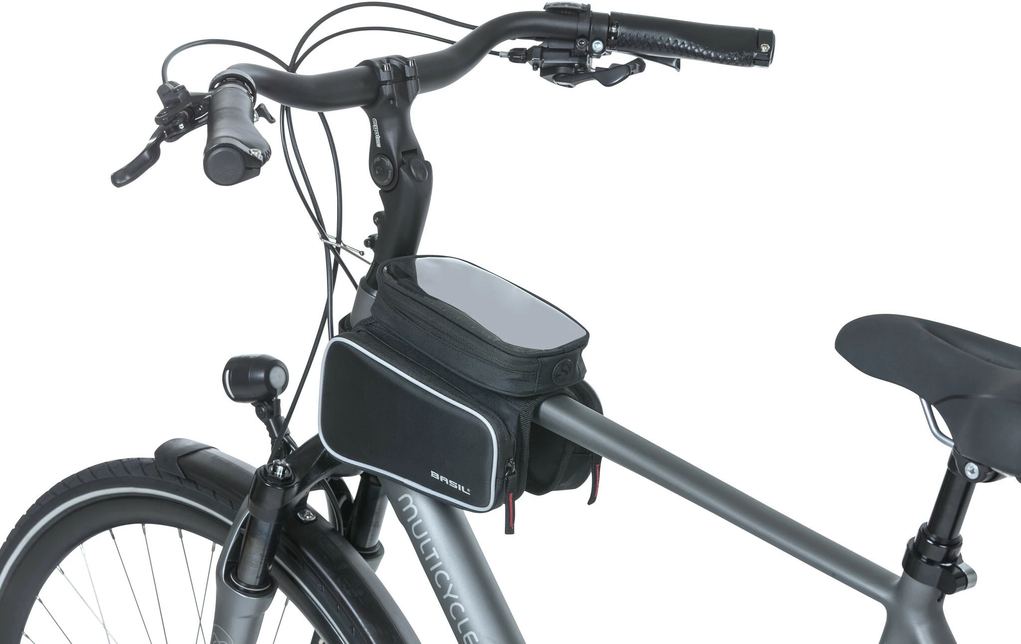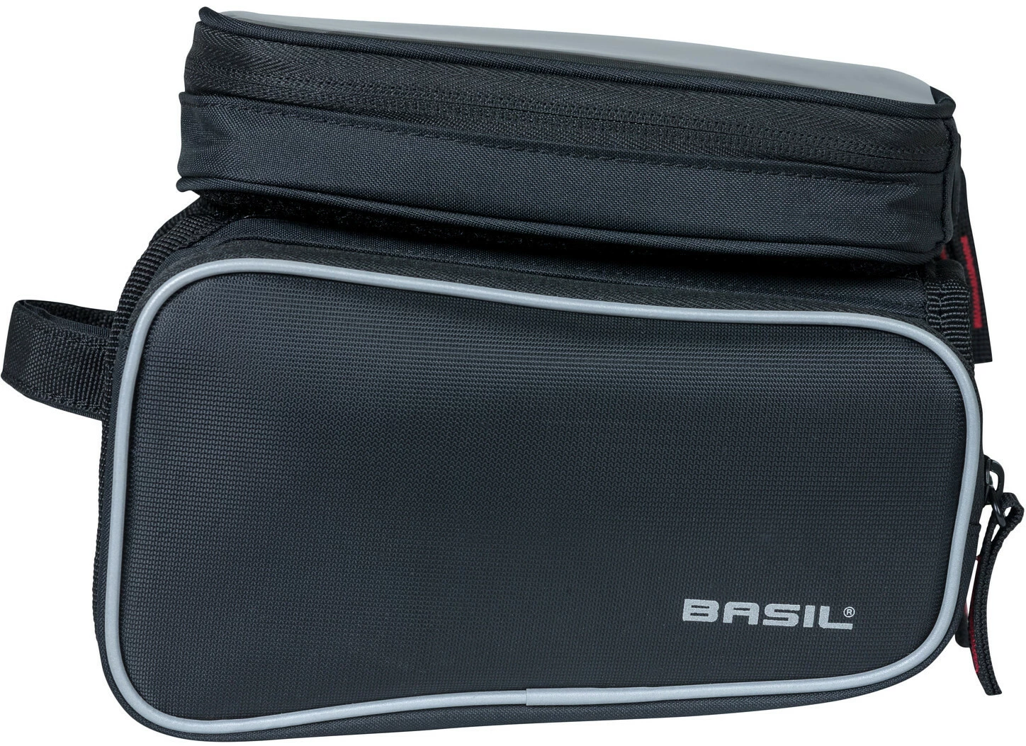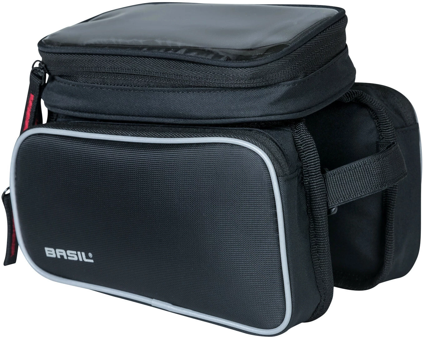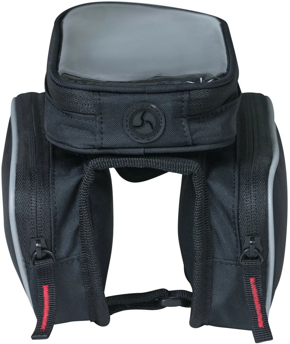 De to sidedele har hver deres eget indre rum. Desuden har denne rammelomme en lille aftagelig lomme øverst til din smartphone. Du kan nemt betjene din telefon på grund af et vindue, der kan berøres. Der er også en åbning til ørepropperne. Den reflekterende overflade på rammelommen gør dig mere synlig i mørket, så du skiller dig ud i trafikken.