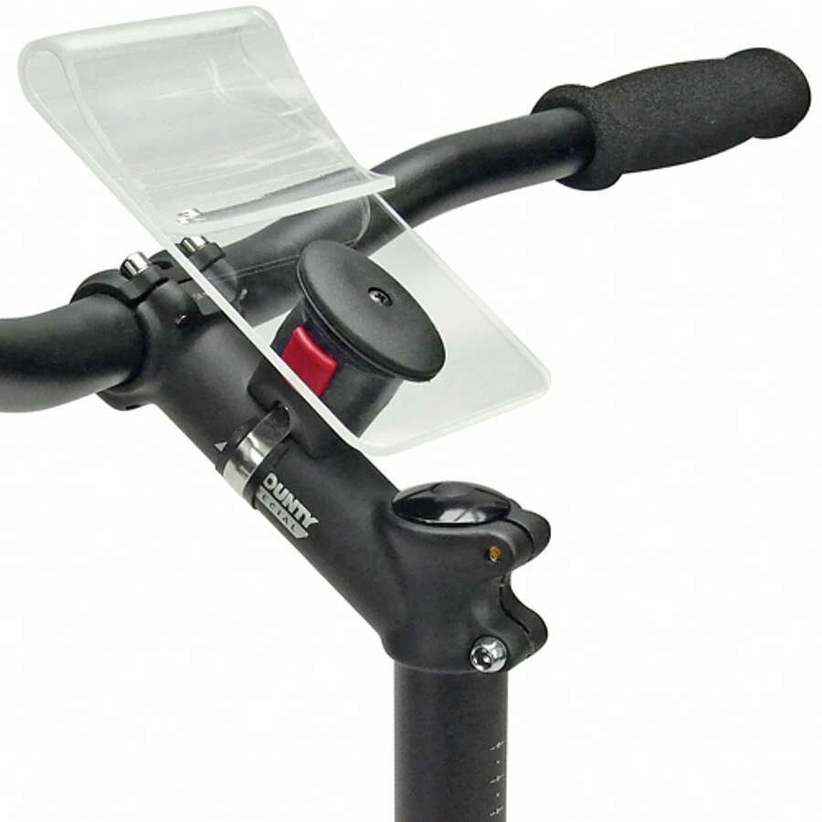 Praktisk kortholder til styr og forgaffel, helt fremstillet af gennemsigtigt plexiglas. Alle kortformater skubbes simpelthen ind i klemmen. Kan også bruges i kombination med styrtasker.