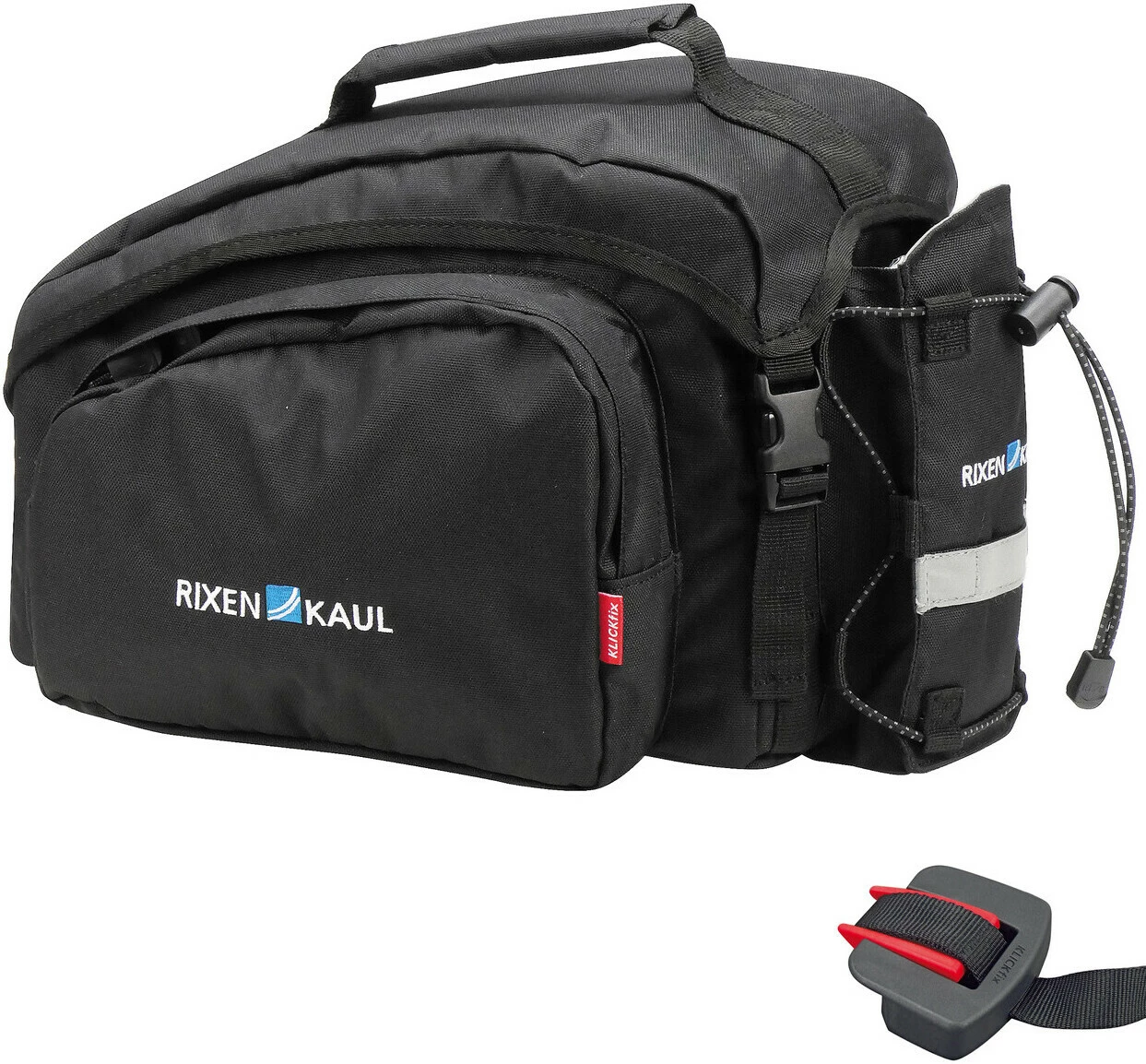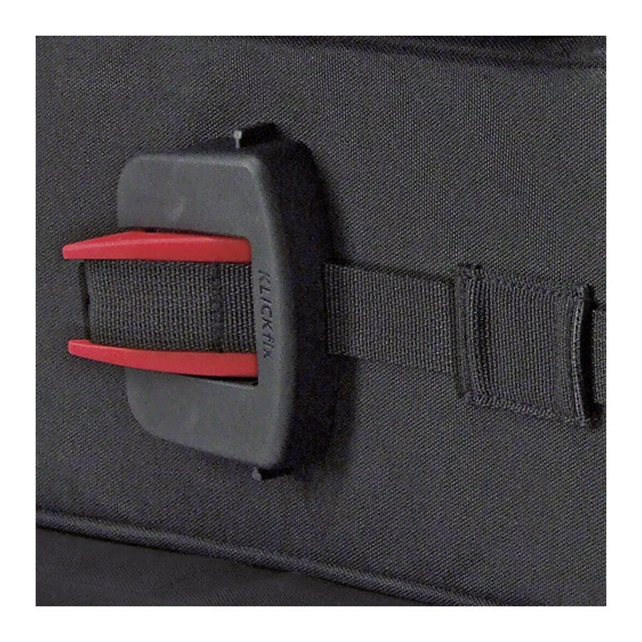 KlickFix-kobling med remudløser i bunden af tasken. Tasken skubbes blot på Freerack- eller Rackpacker-bæreren og låses automatisk og sikkert. Du skal blot trække i stroppen for at fjerne tilbehøret!