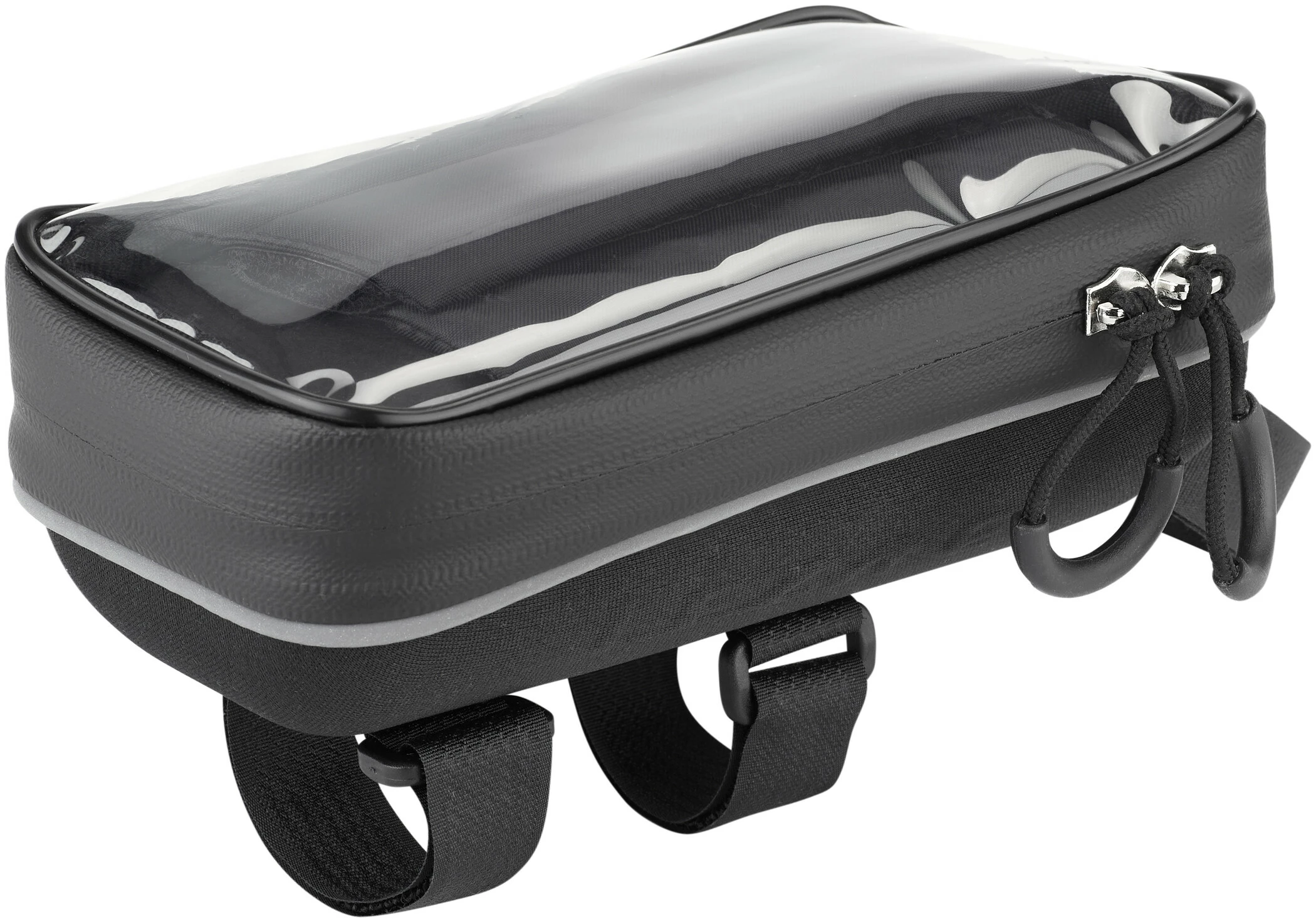 Letvægts, halvstiv smartphoneholder monteret på toprøret. Formstøbt EVA-skumstruktur med slidstærkt vævet nylonbetræk. Kompakt design med ekstra bred muslingeskal-åbning. Mesh-inddeleren hjælper med at holde tingene på plads. Smartphone-lommen kan rumme populære 4-5 tommer modeller. Klar, touchscreen-kompatibelt cover. Sikker, tre velcroremme-design fastgøres til toprøret.