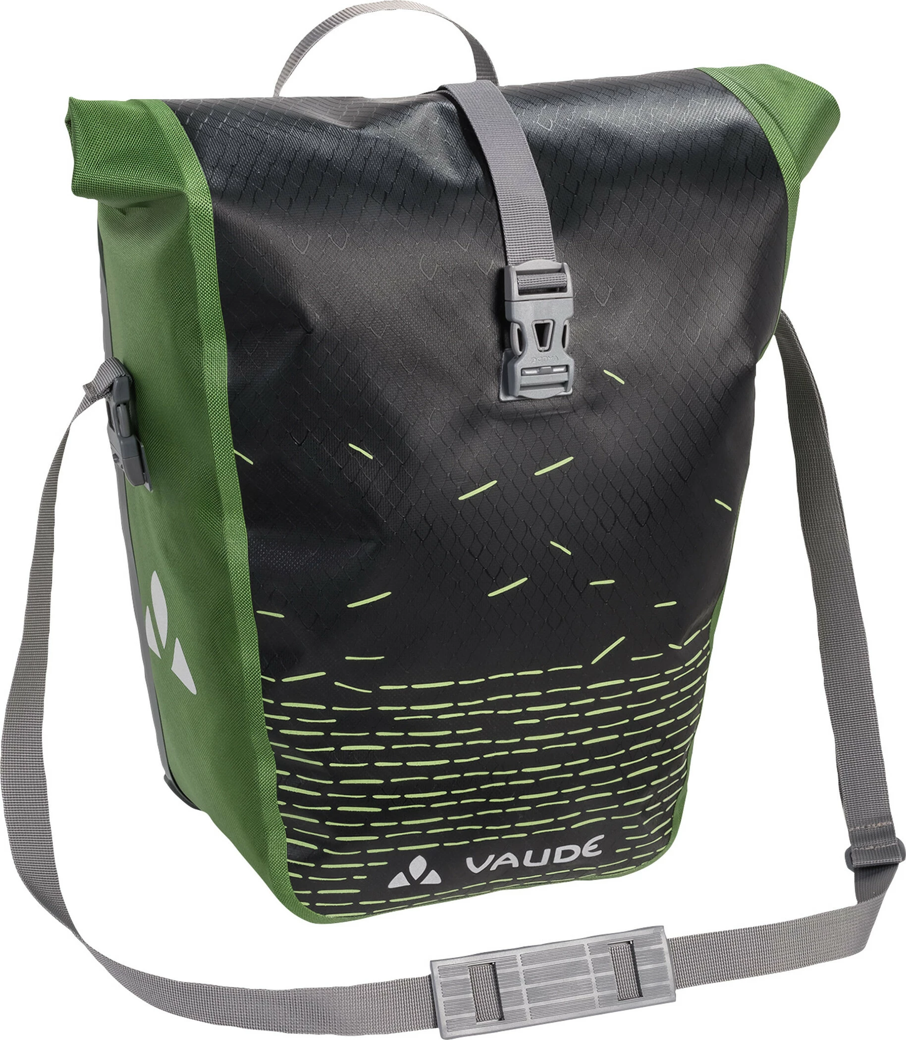 Kom ud og udforsk verden omkring dig! Den vandtætte bagagekuffert med et diskret print er klimaneutralt fremstillet i det tyske VAUDE-hovedkvarter nær Bodensøen af slidstærkt, PVC-fri presenningmateriale. Med en rullelukning, der giver dig mulighed for at tilpasse posens størrelse og forsegle den, så den er vandtæt. En ekstra indvendig lomme gør det nemt at opbevare ting separat. Tasken er sikkert fastgjort til enten højre eller venstre side af bagagebæreren med QMR 2.0-systemet, som også giver mulighed for nem justering og hurtig på- og afmontering. Med en cykellås kan den låses direkte fast på QMR-krogen. Reflekselementer sikrer høj synlighed i trafikken og ved svagt lys. Inkluderet: en taske (enkelt).