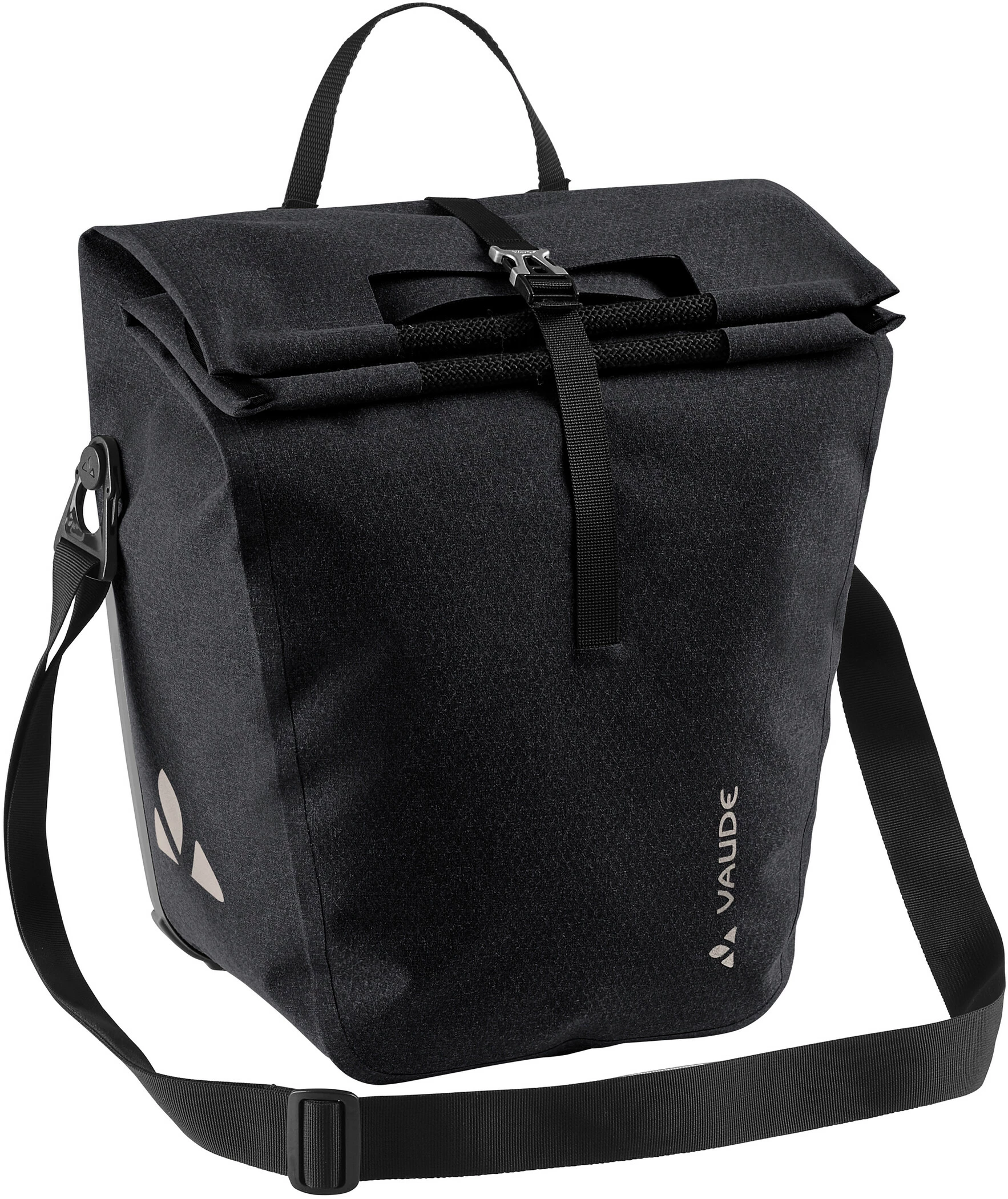 De stilfulde tasker i shopper-design er udstyret med robuste, bløde polyesterhåndtag med stropper, en rund halsudskæring for bedre adgang og en støvpose for bedre fastholdelse af indholdet. Den aftagelige skulderrem og de reflekterende logoer fuldender funktionerne. Tasken er en del af Vaude’s Made in Germany-serie. Med en lille U-lås (f.eks. Abus 145/20) kan ReCycle Back låses direkte på QMR-krogen.