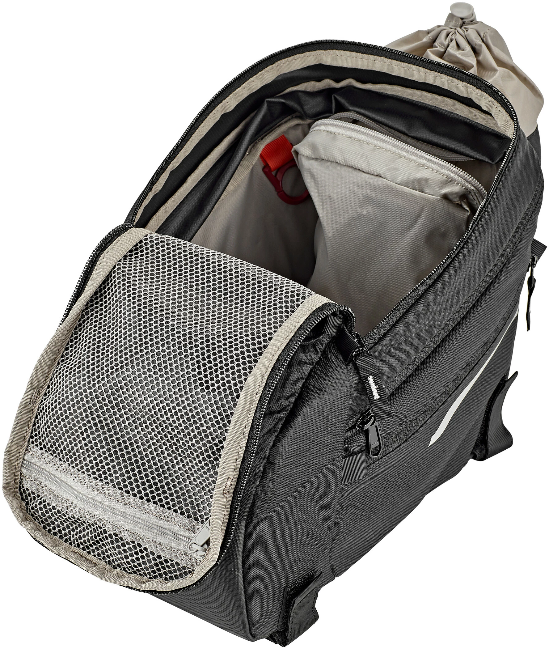 Tager luget ud af bagagen. Denne racktaske har 9+2 liters bærekapacitet og en flaskeholder med nem velcrofastgørelse. En god størrelse til opbevaring af batteriet til din e-bike. Der medfølger også et transportnet for ekstra opbevaringsmuligheder.