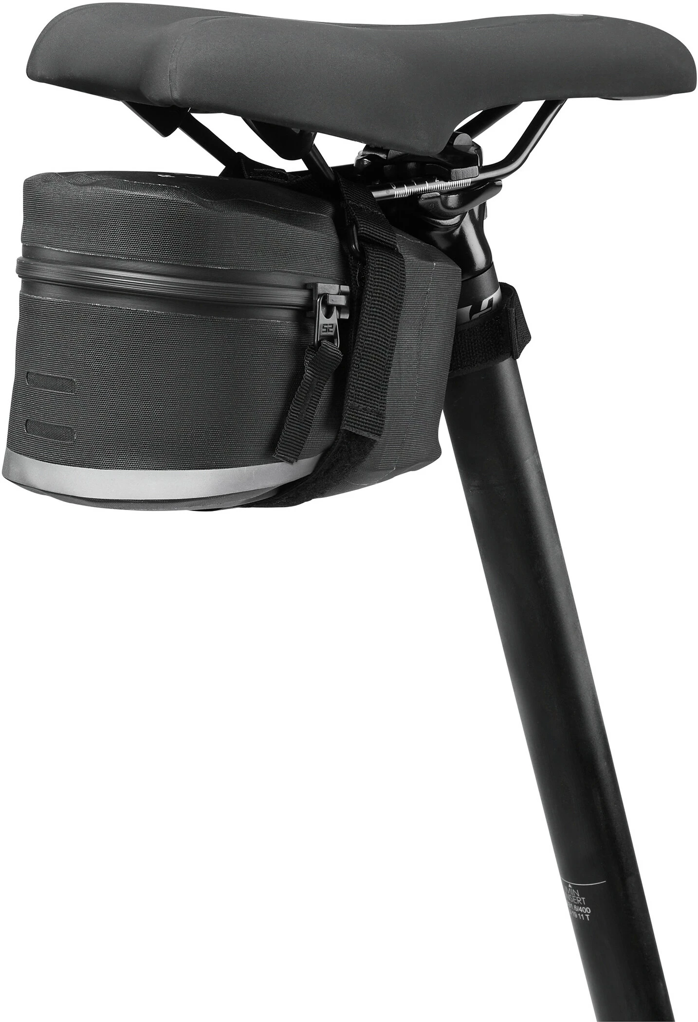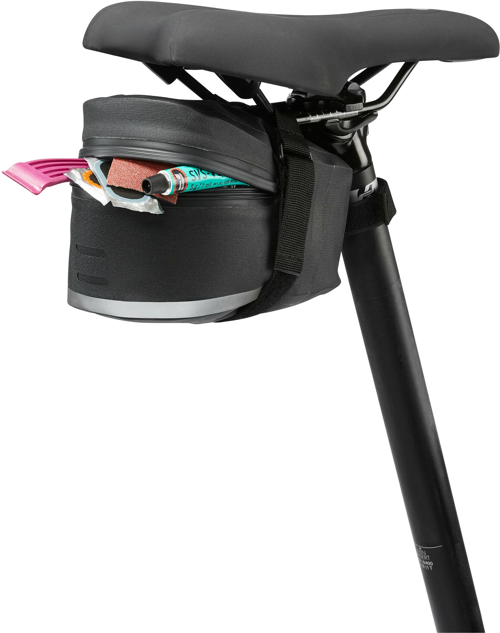 Den vandtætte hf-svejste Tool Aqua XL-sadeltaske giver plads nok til din telefon, nøgler og en lille regnjakke. Du kan også bruge den til sikker opbevaring af dit værktøj, en minipumpe, et reservedæk og din lås. Den kan åbnes med lynlås for nem adgang til dit udstyr og kan fastgøres sikkert under cykelsædet med det optimerede velcrofastgørelsessystem.