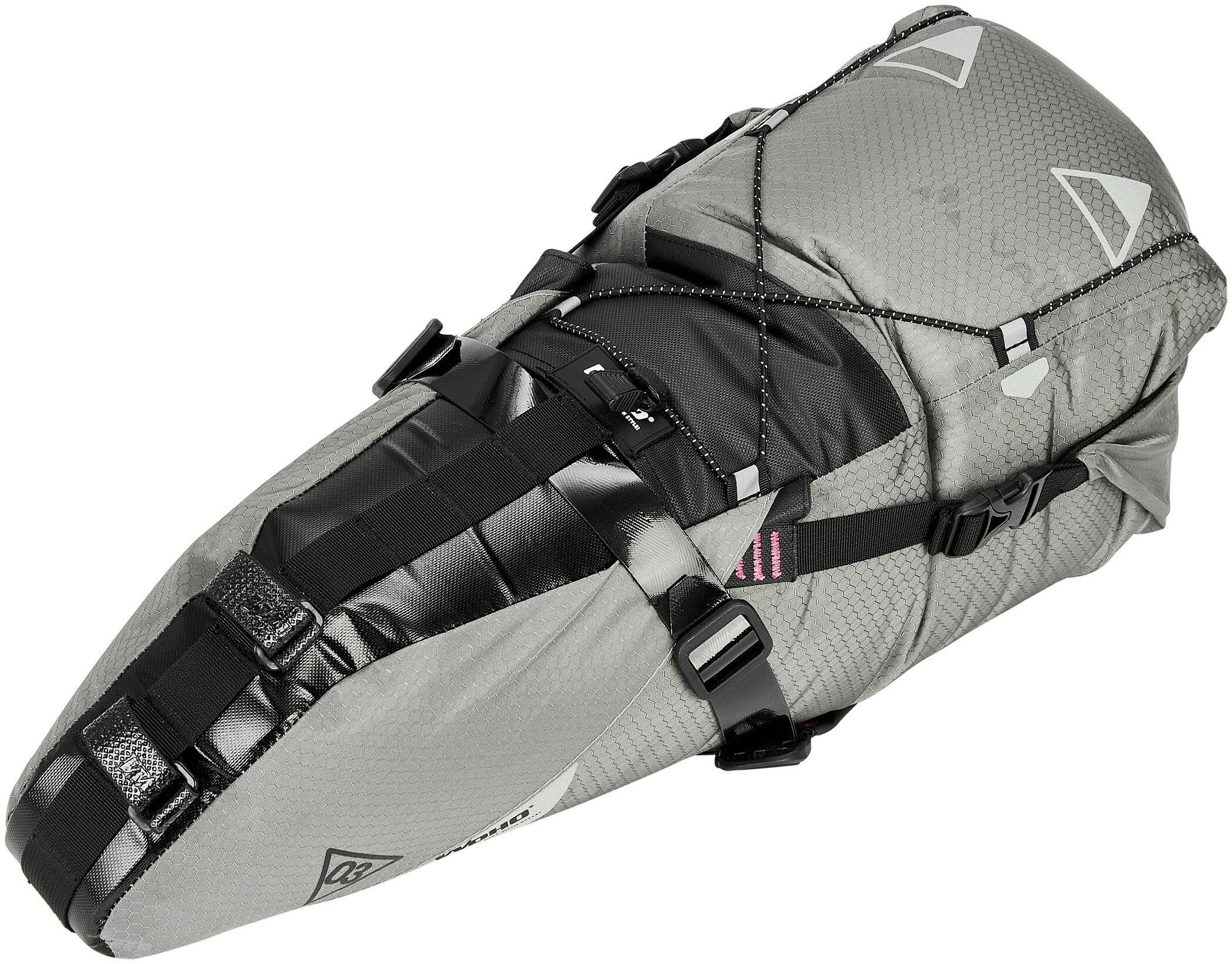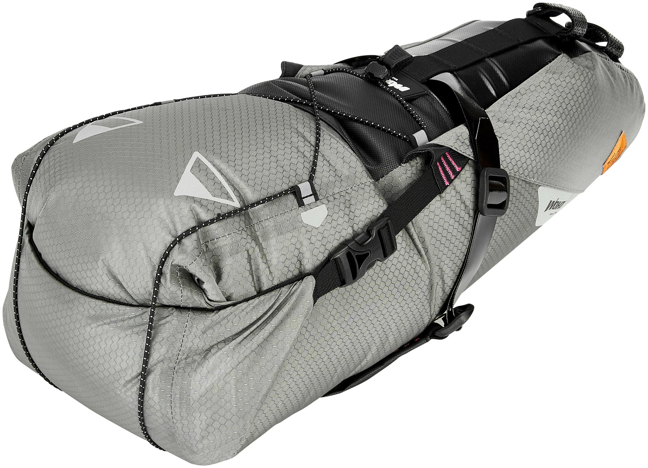 Denne taske er fremstillet af vandtætte materialer af høj kvalitet og er optimeret med hensyn til holdbarhed og vægt. Låsestropperne til sadelskinnen, 3-punkts fastgørelsessystemet og roll-top-spændet arbejder sammen for at minimere vridning og drejning, så du kan koncentrere dig om vejen foran dig. Du kan presse posen ned til 8 liter eller udvide den til ca. 13 liter.
